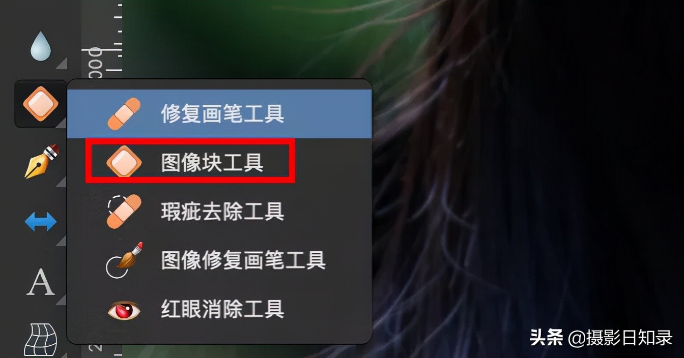 有这两个图层后,我们就可以直接使用修复工具组中的图像块工具,分别在两个图层上去调整。注意点是,如果是大的痕迹瑕疵,建议使用高频去修复,如果是颜色瑕疵,可以使用低频。