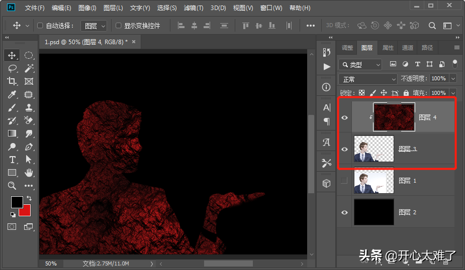 执行“Ctrl+L”调出色阶,向右拖动滑块,直到画面出现岩石的效果。