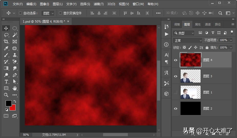 新建一个空白图层。前景色选择黑色,背景色选择红色。点击菜单栏的“滤镜”、“渲染”、“云彩”。制作一个红色的云彩。