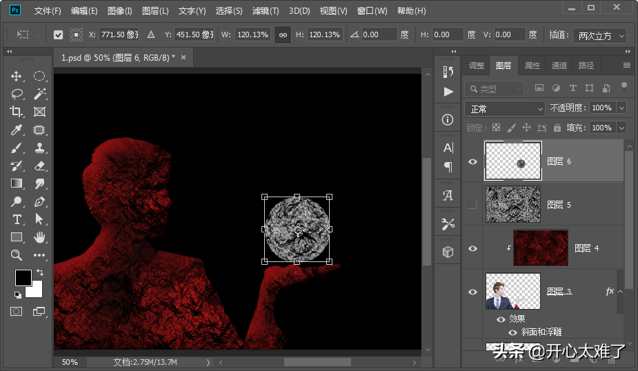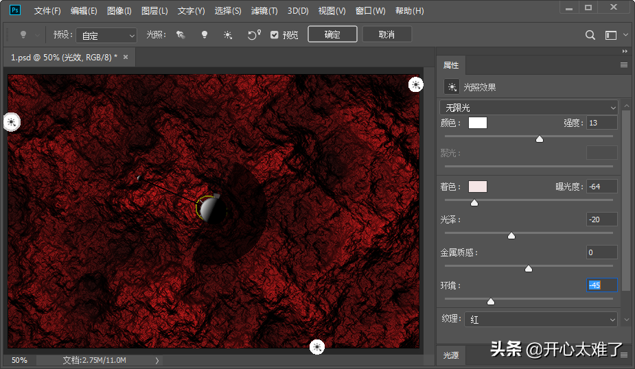 点击菜单栏的“滤镜”、“渲染”、“光照效果”,调整参数,营造一种岩石的效果。