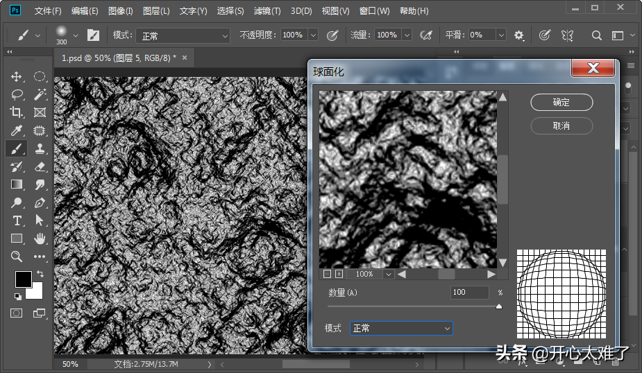 点击菜单栏的“滤镜”、“扭曲”、“球面化”,数值拉到最大。