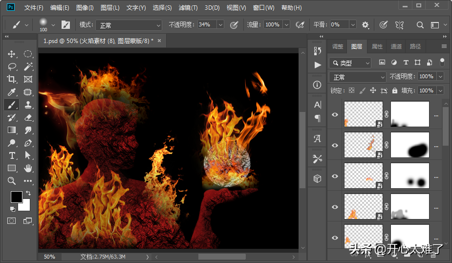 重复拖入火焰素材,调整大小和位置,添加图层蒙版。