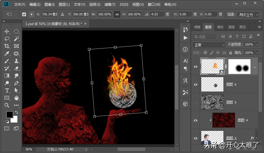 拖入火焰素材,执行“Ctrl+T”调整大小和位置,添加图层蒙版,隐藏不需要的区域。