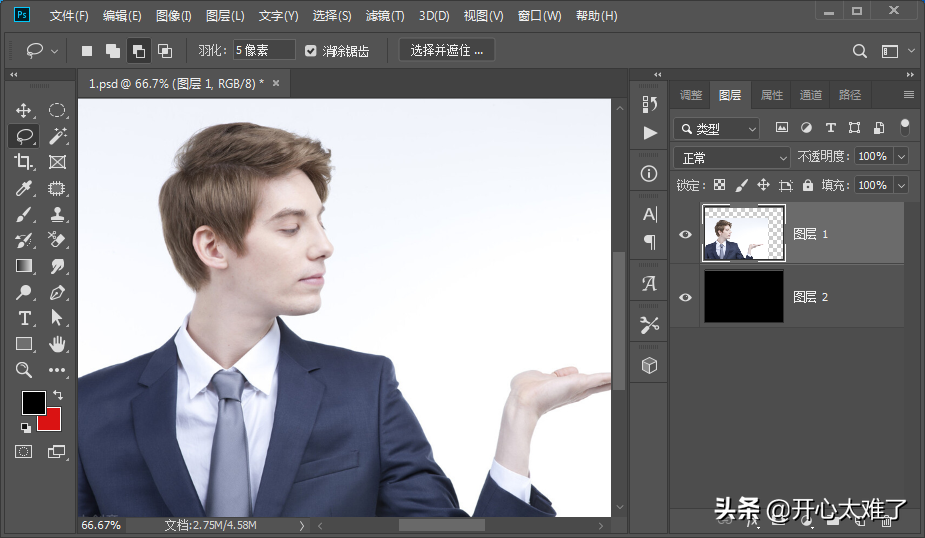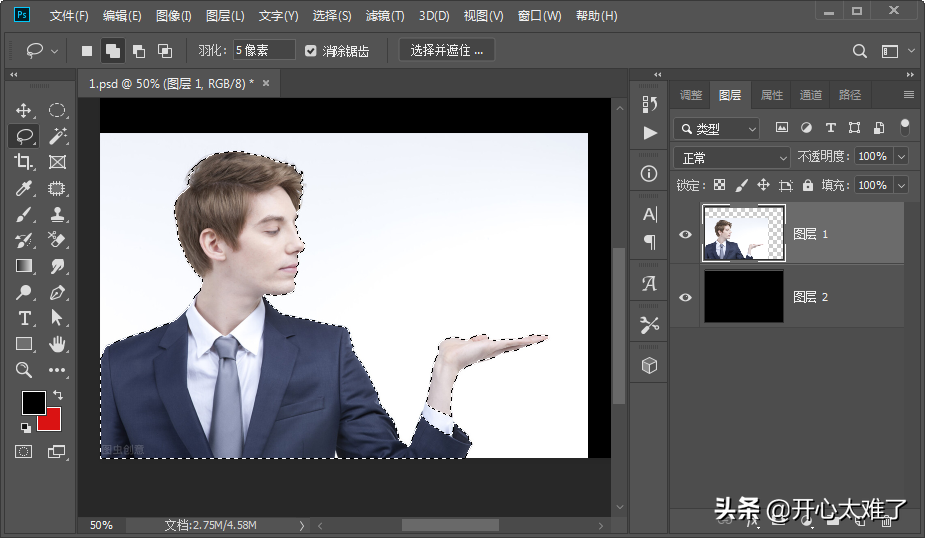 点击菜单栏的“选择”、“主体”,选择出人物主体。如果识别人物主体不完整,可以使用“套索工具”辅助选择。具体方法以前说过,这里不再多说。