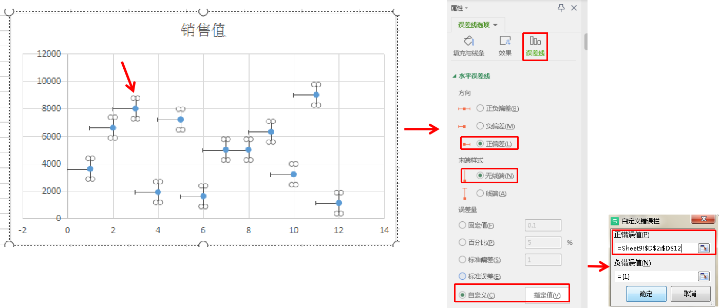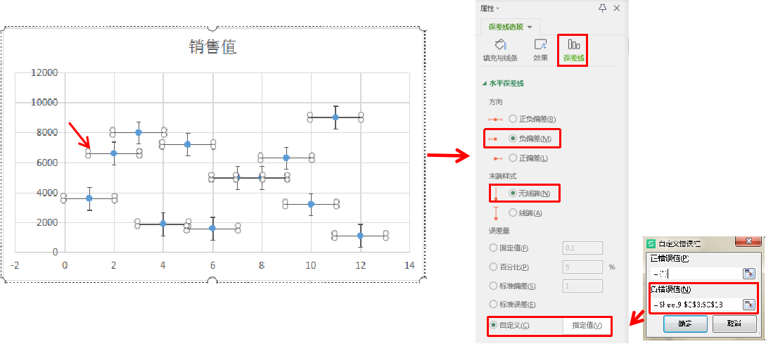 选中X轴的误差线,快捷键”Ctrl+1″误差线选项,水平误差线方向为”负误差”,末端样式”无线端”,误差量”自定义”,负错误值选择辅助列1(C2-C13)的数据。
