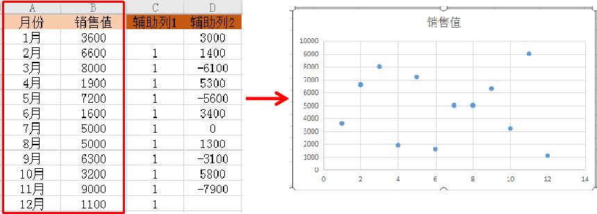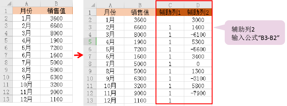 在原始数据基础上,添加辅助列1,C3-C13单元格输入数值1,添加辅助列2,D2单元格,输入公式“B3-B2”,依次填充,到D12单元格结束。