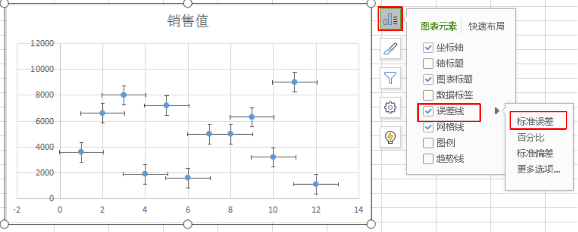 选中Y轴的误差线,快捷键”Ctrl+1″误差线选项,水平误差线方向为”正误差”,末端样式”无线端”,误差量”自定义”,正错误值选择辅助列2的数据。