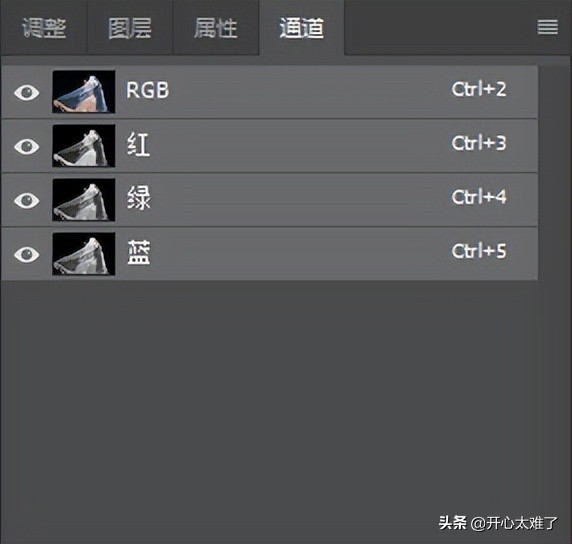 我们的显示屏采用的是RGB颜色模式,包括红、绿、蓝三原色。打开PS的通道面板就可以看到了。