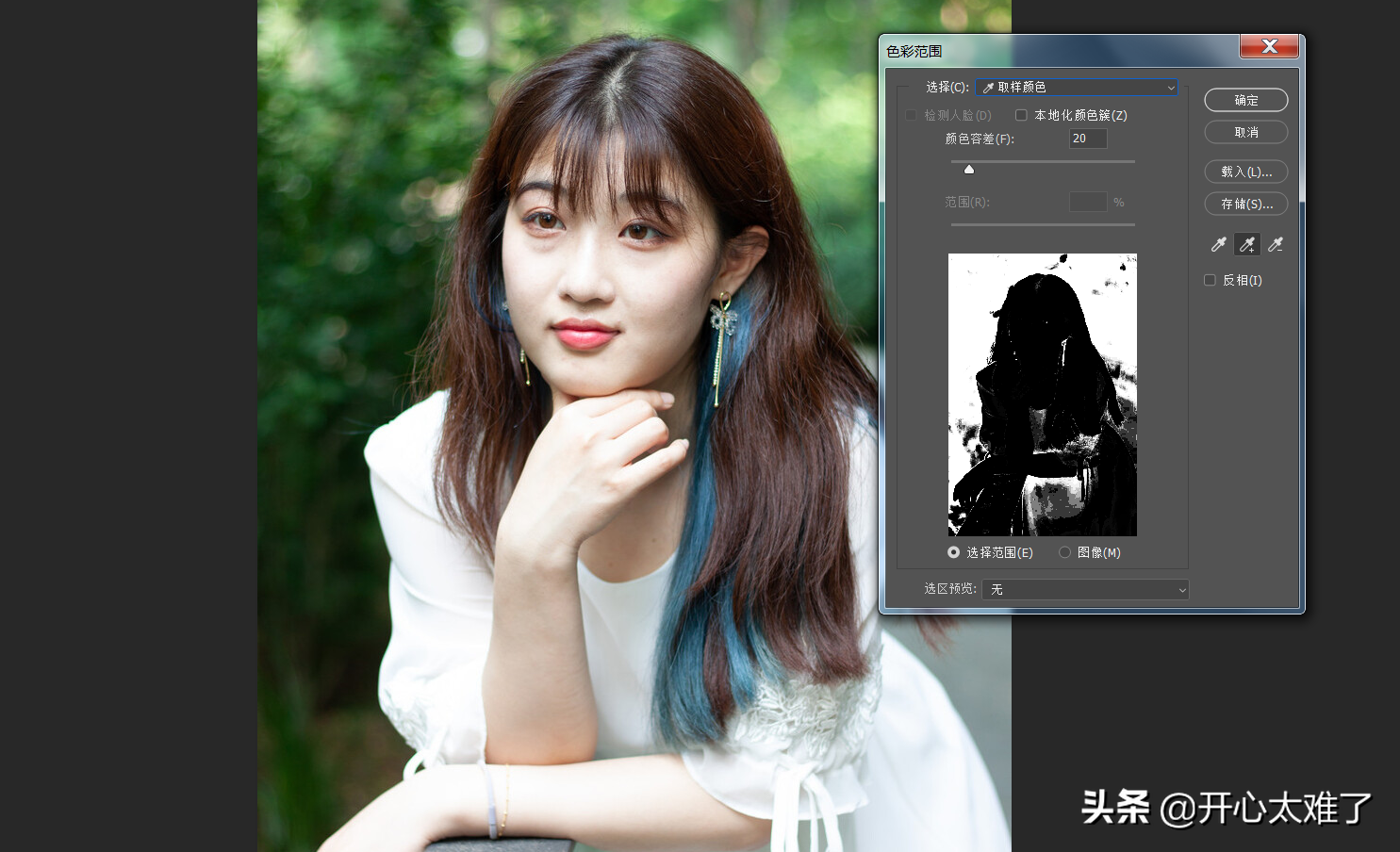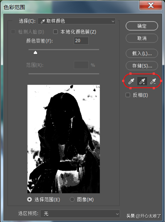 选择第一个吸管,选择一种颜色。选择第二个吸管,点击画面,把点击到的颜色添加到选择区域。第三个吸管,从选择区域内减去所点击的颜色。色彩范围预览图中,白色区域是选择到的区域,黑色区域是没有被选择的区域,灰色是半选择的区域。通过三个吸管工具的配合,把主体从画面中选择出来,即主体呈现黑色,主要是人物头发的部分呈现黑色即可。