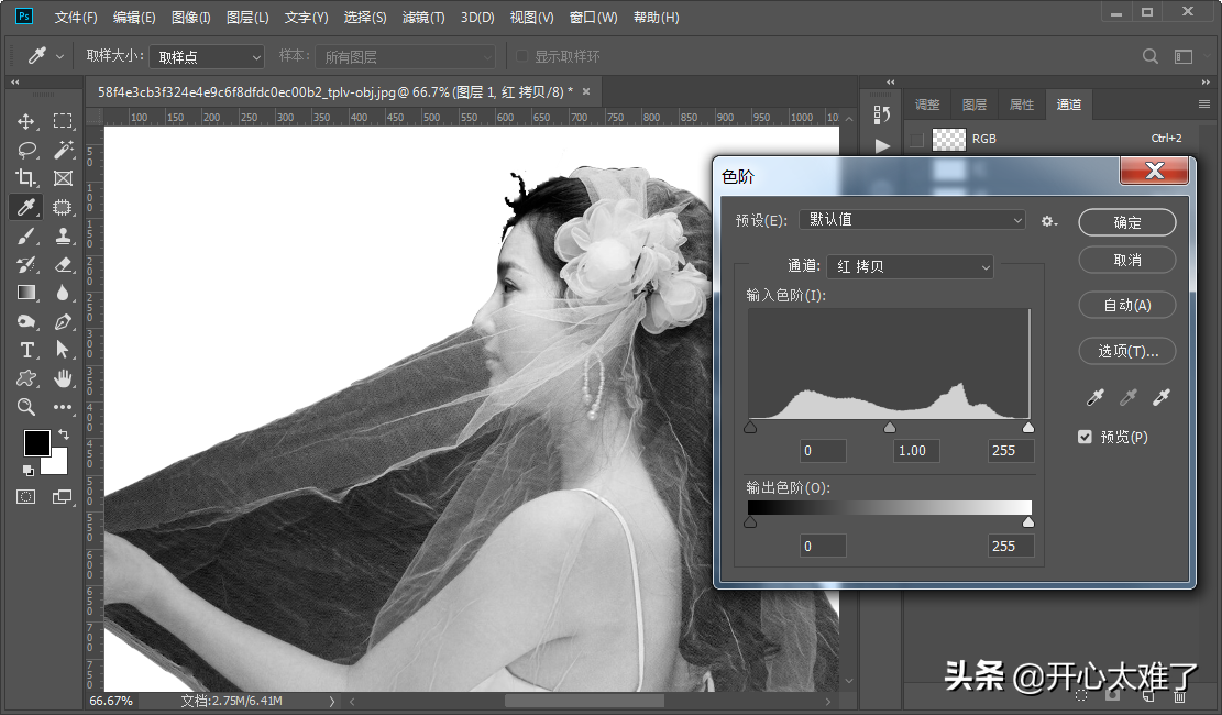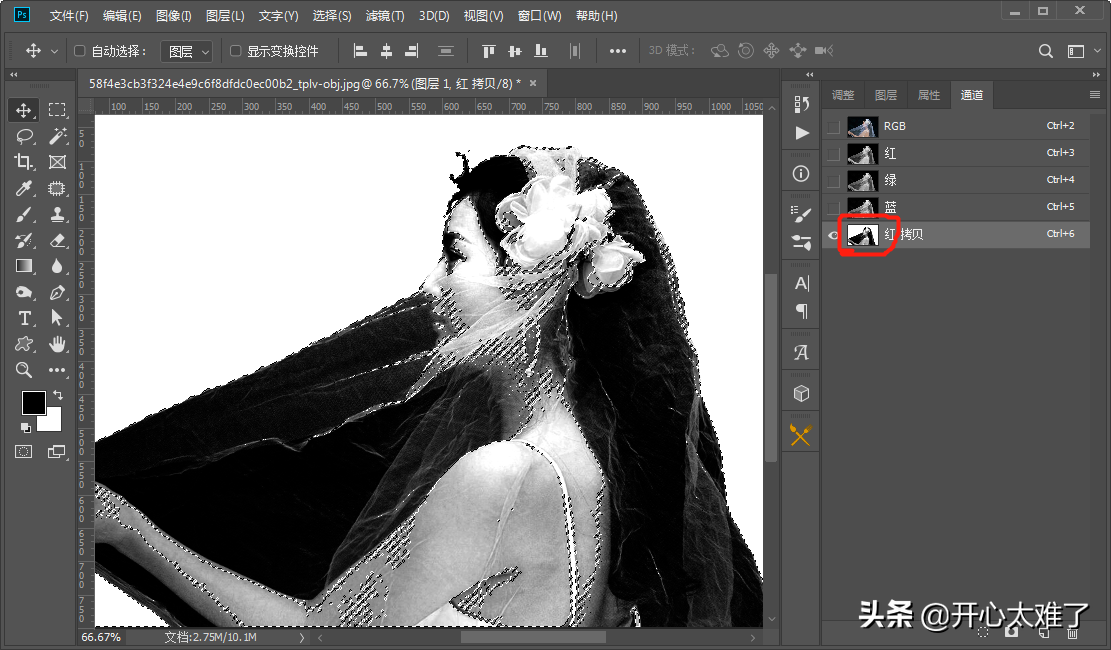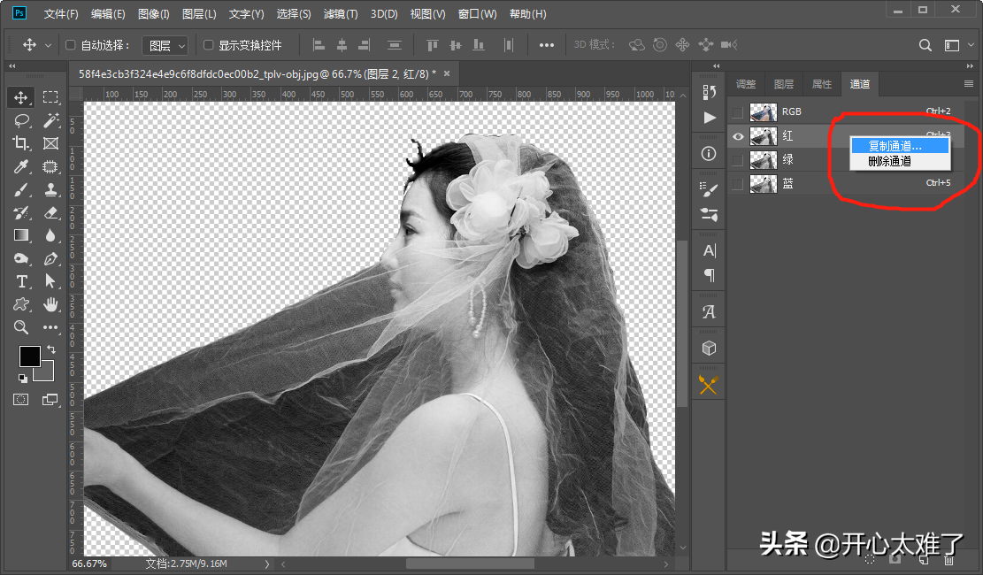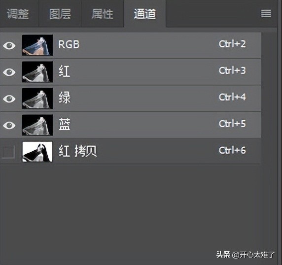 打开通道面板,选择一个对比强烈、清晰度高的通道。如上图,选择红色的通道。