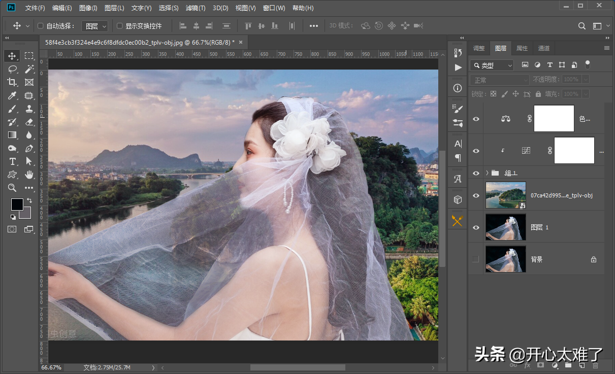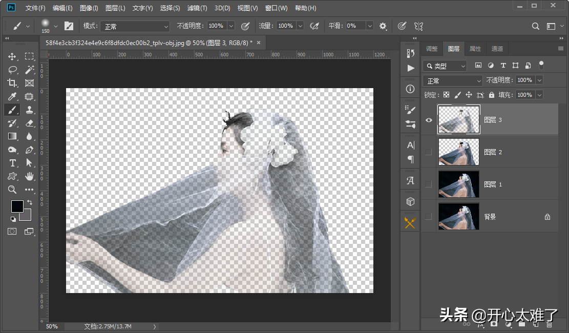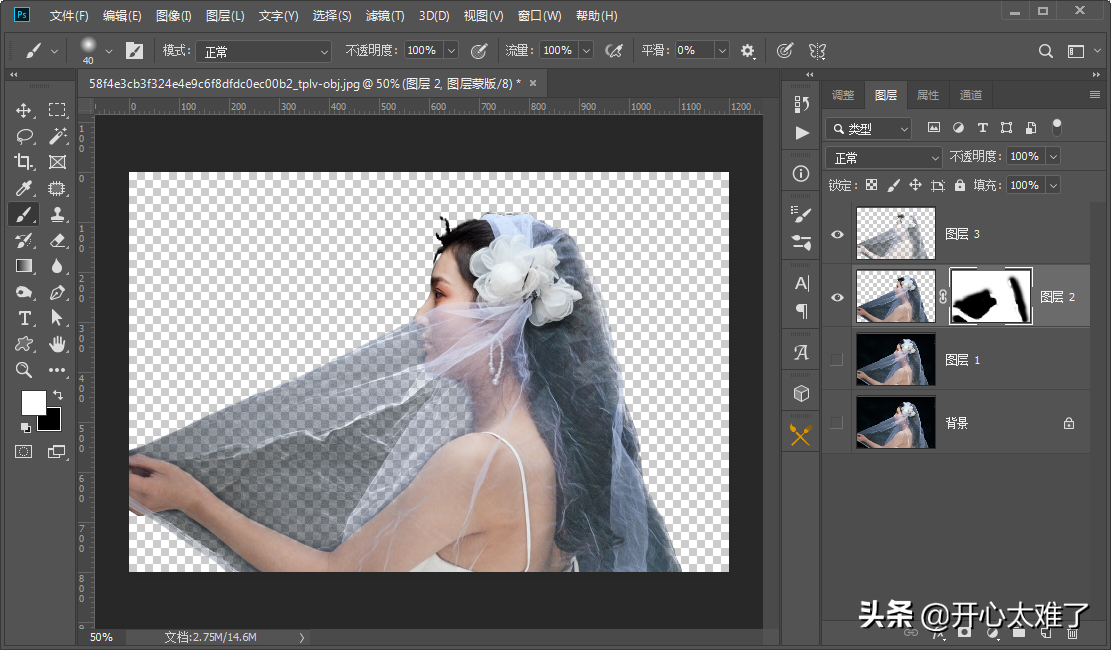 添加蒙版,用黑色画笔涂抹隐藏头纱上面的透明区域。涂抹的过程中按“{和}”快捷键调整画笔笔触的大小,不要涂抹到多余的区域。多涂的区域用白色画笔涂抹修复。