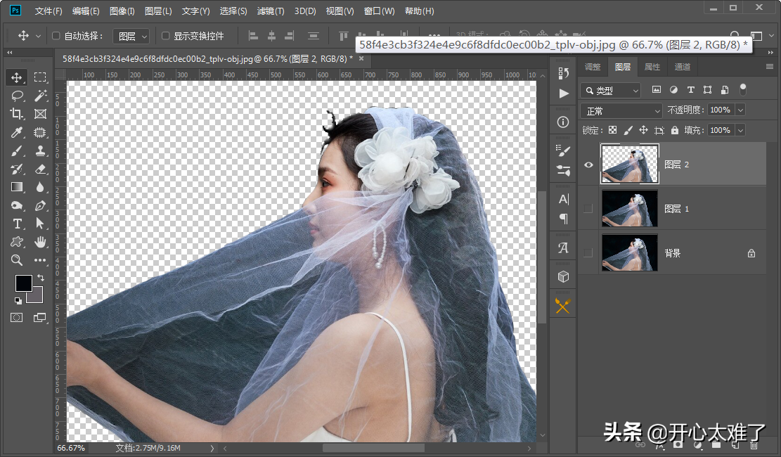 我们以这个头纱为例,介绍一下通道抠图的具体操作。首先,我们用钢笔工具,把人物主体从背景中分离出来。