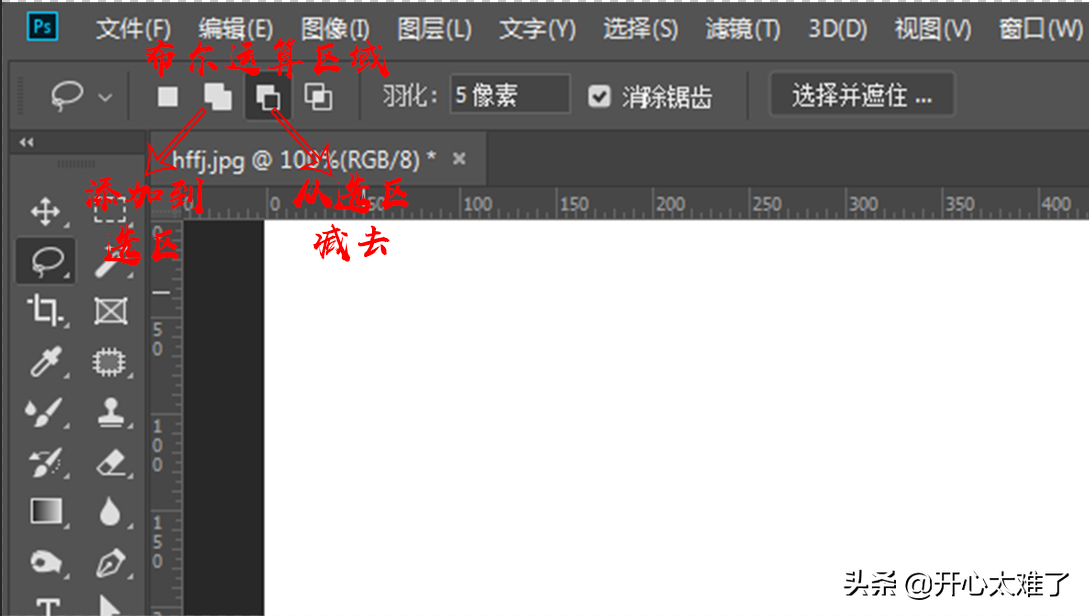 布尔运算的运用,选择“添加到选区”按钮,套索圈起来的区域自动添加到以前的选区中。选自“从选区减去”按钮,套索圈起来的区域自动从以前的选区中减去。