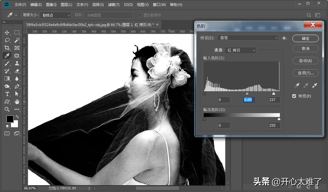选择复制的红色通道,执行“Ctrl+L”快捷键,打开色阶面板。调整色阶面板,增强画面的对比度,直到画面黑白分明,清晰度高为止。