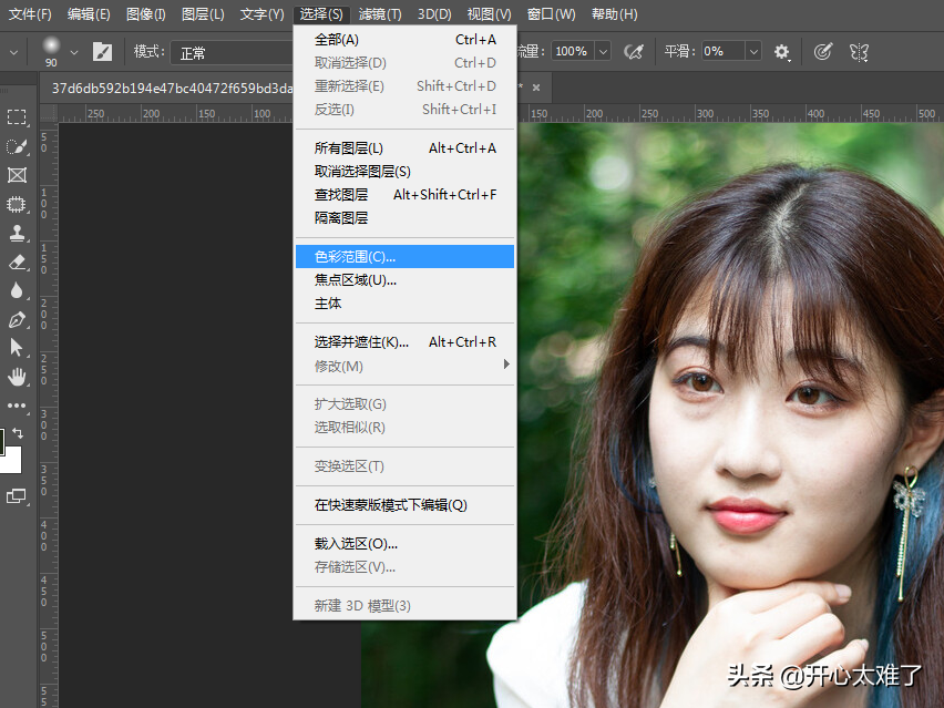 菜单栏中点击“选择”,“色彩范围”,可以打开“色彩范围”面板。使用色彩范围可以对人类的头发,动物的毛发等颜色对比鲜明的图像进行抠图操作。