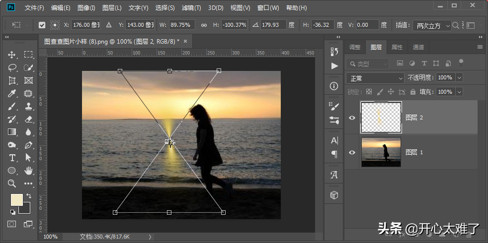 按“Ctrl+T”键,用变形工具压成一条直线。按“回车”键应用。使用变形工具缩小的时候,新版本的PS需要按住“shift”,否则左右两边也同时缩小。老版本相反,等比例缩小需要按住“shift”键。大家注意一下这个问题。