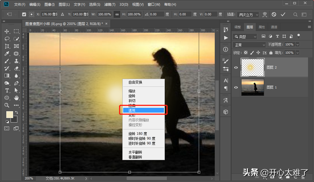 按“Ctrl+T”打开变形工具。点击鼠标右键,选择“透视”。