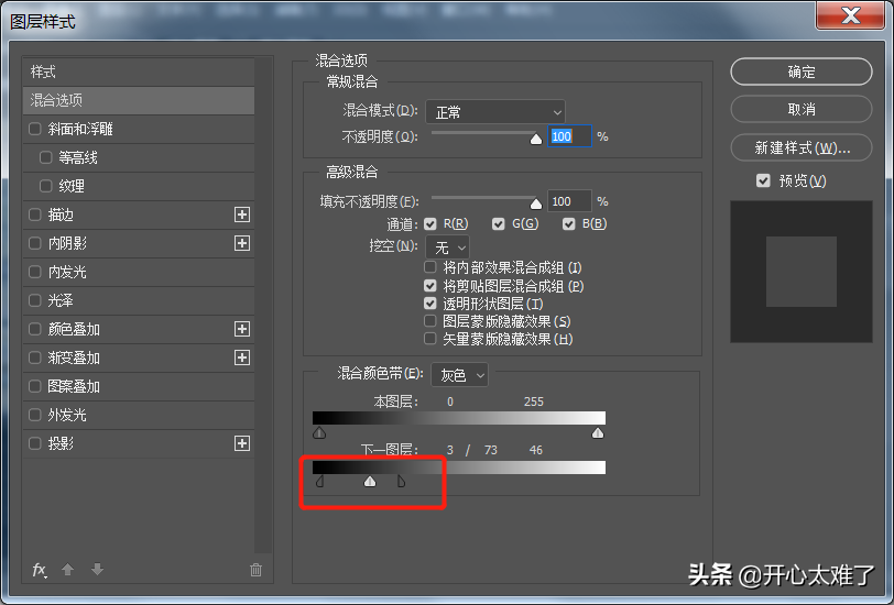 拖动“混合颜色带”下面的滑块,调整色块的显示效果。通过调整滑块,光影只作用在下面图层的亮部区域。按住“Alt”键点击滑块,可以分离滑块,进行精细调节,打造更真实的效果。