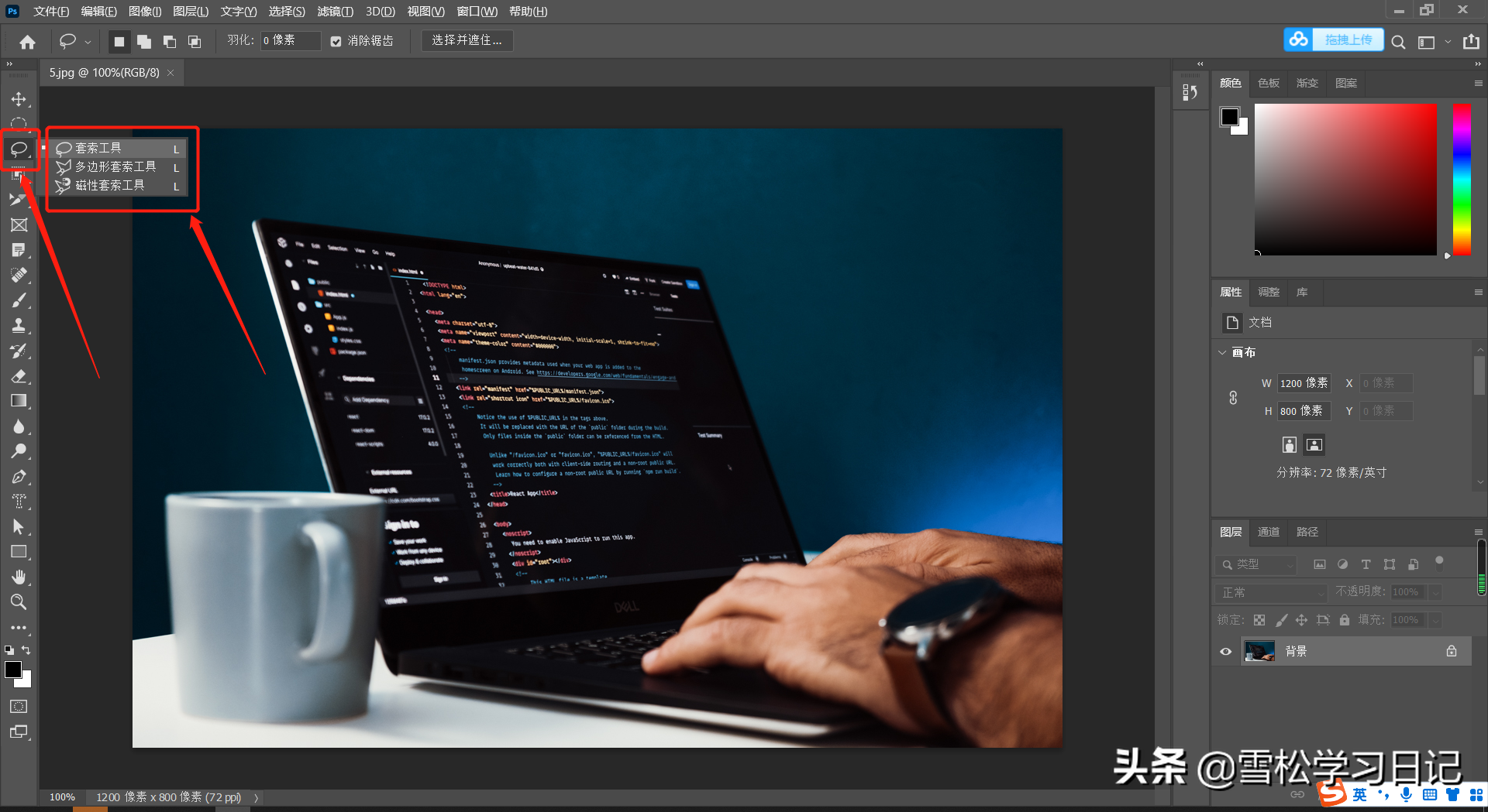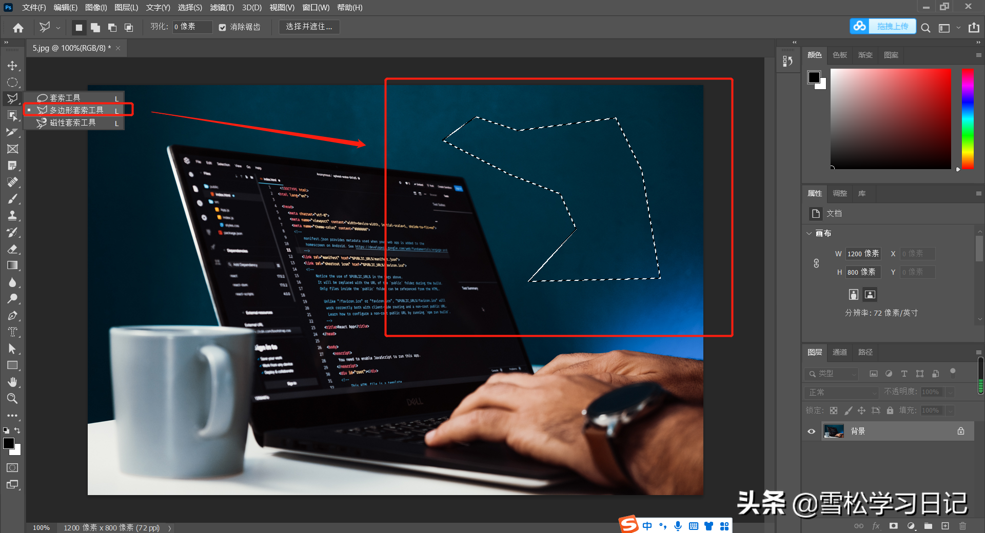 今天的第二个是多边形套索工具,顾名思义,他就是可以进行一个任意的多边形的选区,使用时需要我们用鼠标左键来定点实现选区位置,最后在开始的位置点击鼠标左键来实现环闭选区,功能和前面学习的一样,如果在使用中画错了位置我们可以使用del键来进行删除点选位置,后面我们需要讲的磁性套索工具也是一样的。如图所示