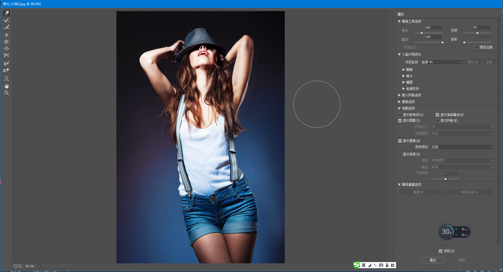 人物瘦身时,我们要选择的是向前变形工具,使用方括号键调整画笔大小,一点点地对图像进行调整,要顺着人物原有的边缘向内收缩,如果出现错误,可以使用撤消命令或者是重建工具都可以。
