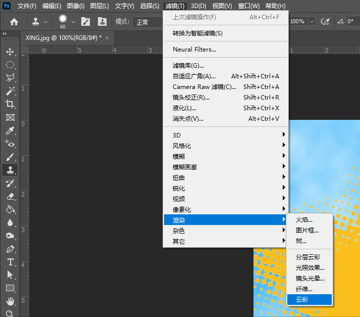 滤镜菜单中常用的命令有:液化、滤镜库(有一些滤镜操作效果没有在菜单中展现出来,需要在滤镜库中查找)、风格化、模糊、像素化和渲染等。上图的这个案例中,背景和以前我们所使用的不一样,即不是图片,也不是颜色(单色和渐变),而是随机的颜色变化填充的。这个效果我们要使用的是滤镜菜单中的渲染命令下的云彩。