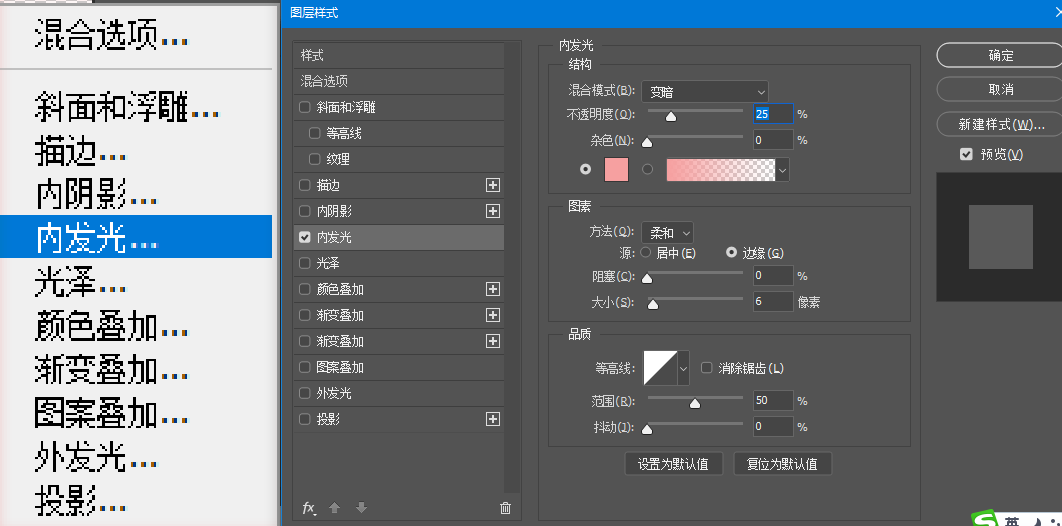 内发光的参数调整:混合模式更改为正常;不透明度大约在60%左右;发光颜色设置为白色;方法改为精确的,源改为居中,相应地调整大小和阻塞的值。