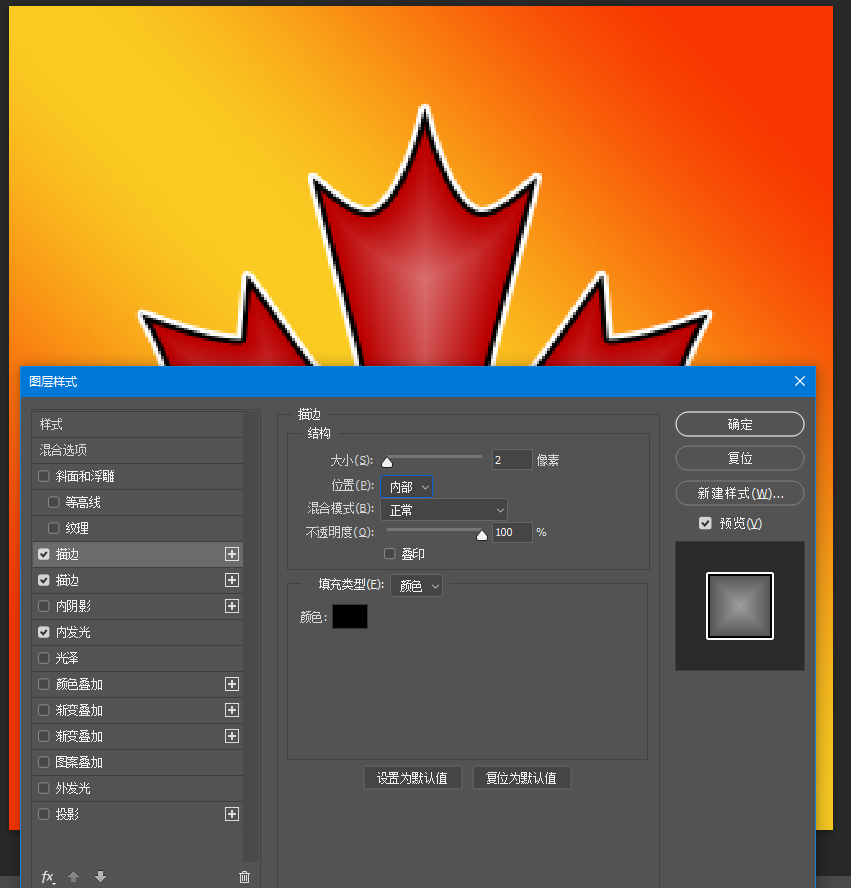 枫叶形状边缘效果的添加,在图层样式中选择描边,将大小调大一些,位置选择外部,颜色调整为白色。