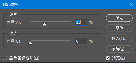 打开阴影/高光命令后,我们可以看到对话框中只有阴影和高光两个调整的位置(注意:我在调整时不需要勾选“显示更多选项”,参数比较多不适合调整)