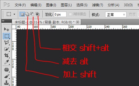 快捷键的含义:按住相应快捷键,再用选择工具选择。且按住快捷键之前,要保证选项栏按钮的第一个被选中。