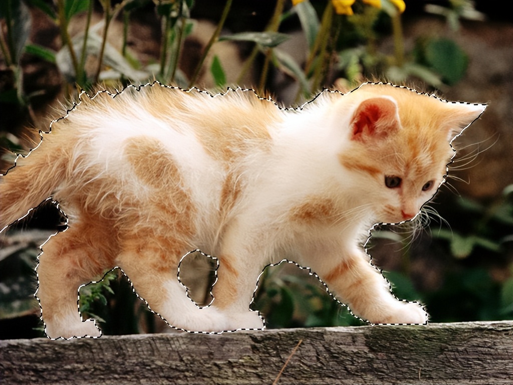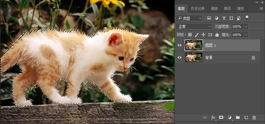 2、图片打开之后,按下快捷键Ctrl+J将图片复制一层,然后选择工具箱中的快速选择工具来选取小猫的选区,接着按住键盘上的Alt键将不需要的区域进行减选,选出小猫的大致轮廓,如图所示: