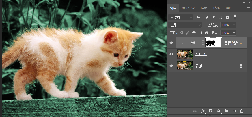7、此时假设我想将背景变为黑白或者是单色调,可以点击这里的色相饱和度,为它添加一个色相饱和度调整图层,刚才的选区就作为调整图层的蒙版,我们可以降低它的饱和度,但是现在猫的饱和度被降低了,这是因为选区的内容是小猫,所以我们双击蒙版,将其反相,再点击属性,如果你希望背景是一种单色调的,那么可以点击这里的着色,然后为它选择一种你喜欢的色调,如图所示: