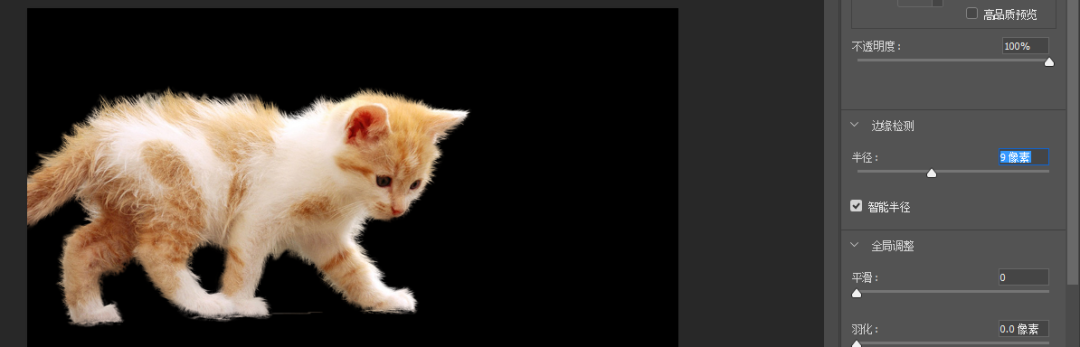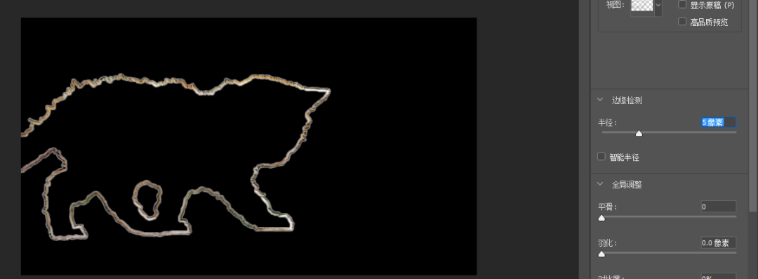 5、假设尾部或者是身体上面这部分的毛发明显得多于耳朵这部分,想加大这部分的半径,可以点击调整半径工具,调整半径工具可以使我们手动地去调节它的半径的范围,假设我在这里绘画以后,然后再点击显示边缘,你会发现这边的半径明显变宽,如果我继续往后面调节,现在看到这里有一些半透明的效果,下面的黑底有一些若隐若现,但是我们知道这一部分全部都是猫的身体,不存在半透明的效果,我们可以通过抹除调整工具将这部分再调整回来,也就是说从半么中减去,如图所示: