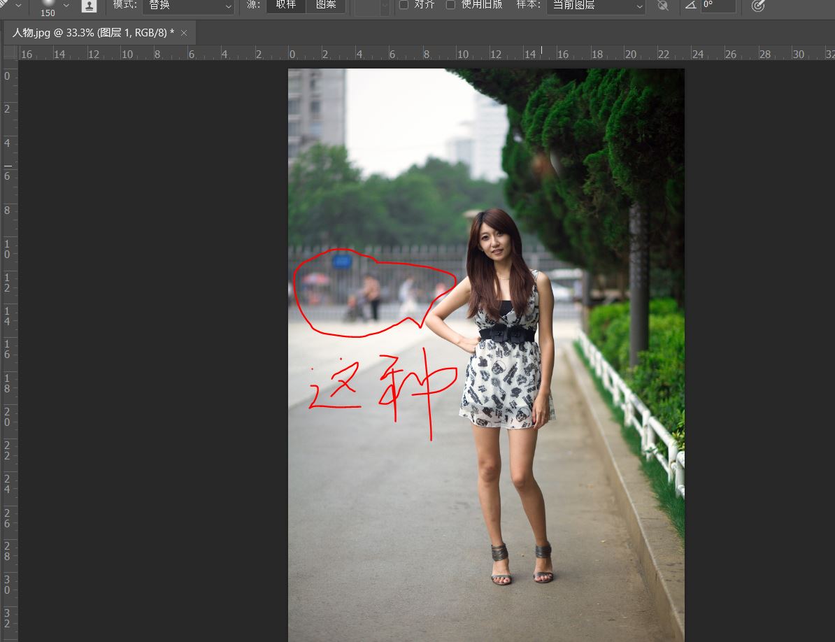 这种素材我们应该经常遇到,背景远景人物模糊,用修补工具不太适合,我们推荐使用修复画笔工具来处理,时间有限我们展示下功能,不做很细致的处理(需花费时间),强调一点,选用柔角画笔(硬度0),模式选择替换,类似与盖章工具,沿着纹理涂抹,更加自然