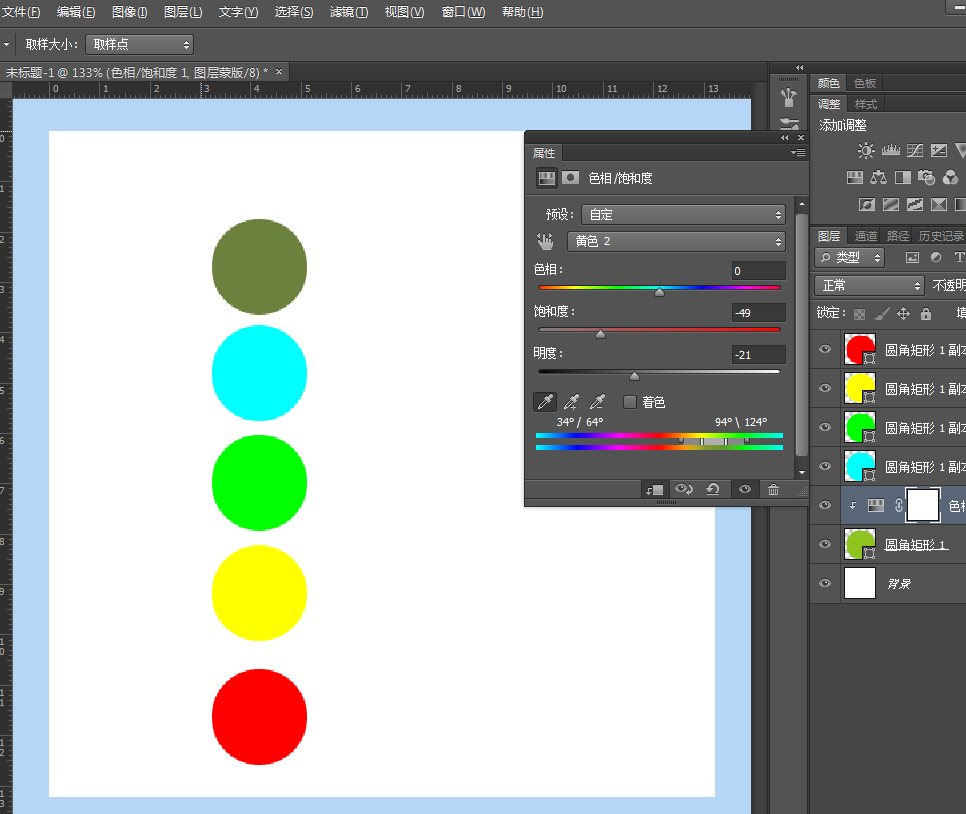 我们点击色相饱和度,用吸管工具吸取一下你想要改变的颜色,如图我吸取了第一个圆形的颜色,我们只要改变饱和度和明度就好,如图第一个颜色就好