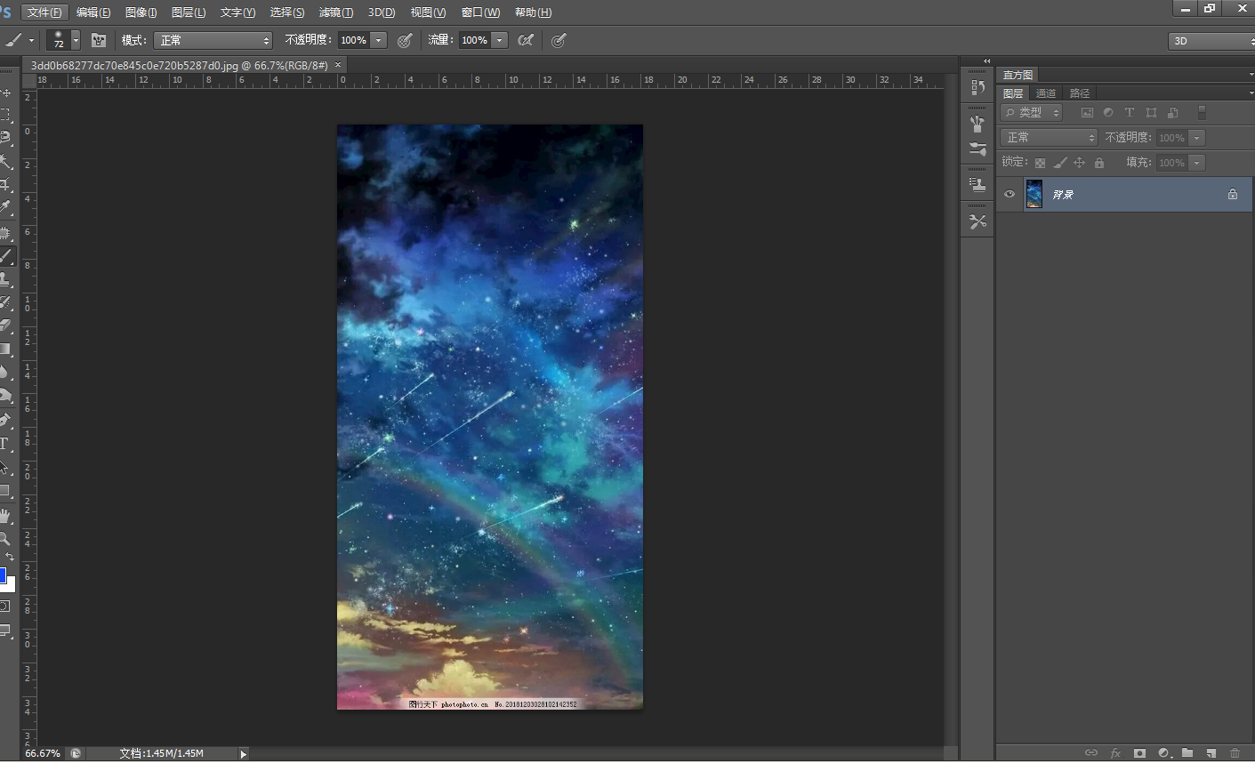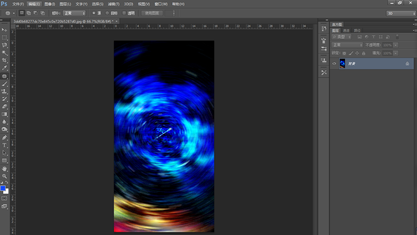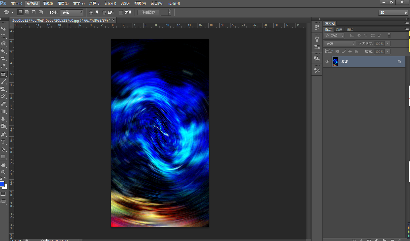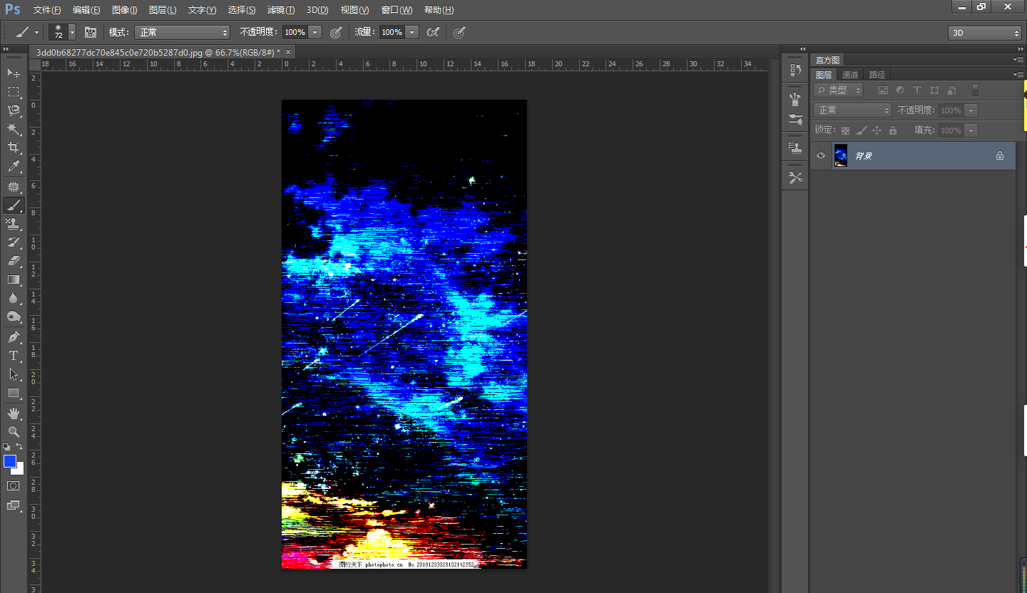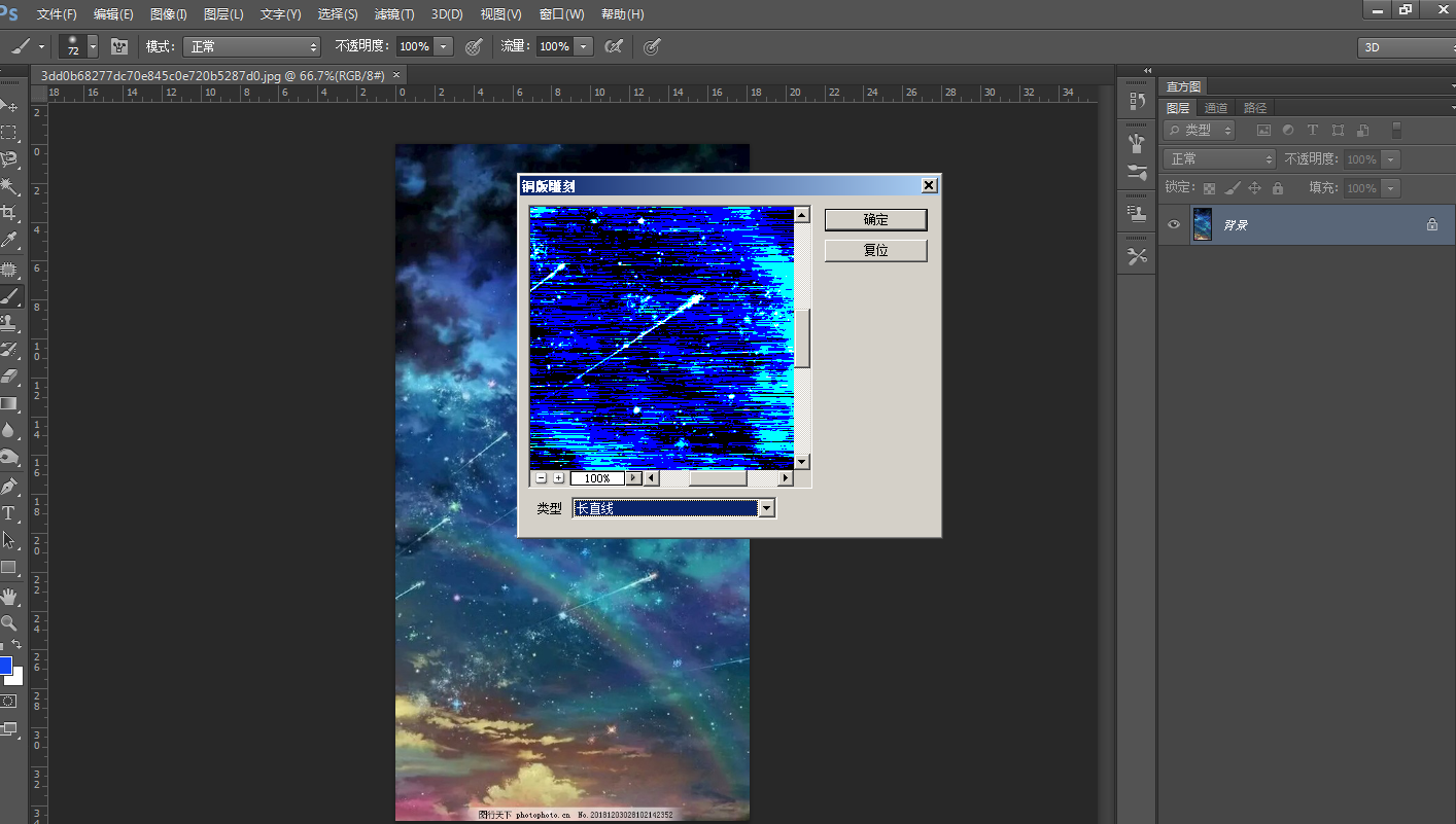 第一步我们思考的是图片背景的颜色丰富多彩的,我们要找一张有多种颜色的图片,一般可以使用星空图,颜色多,也方便找到。第二步是如何把背景变为线条,我们可以用铜板雕刻滤镜,在滤镜-像素化-铜板雕刻可以找到,该滤镜可以在图像中随机生成各种不规则的直线,曲线和斑点,是图像产生年代久远的金属板效果,我们把背景变成直线,第三步我们观察图片中的直线是扭曲的,我们可以用滤镜-扭曲效果来设置,现在我们来看一下具体步骤