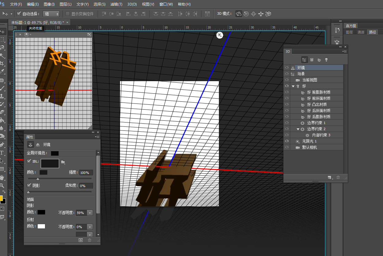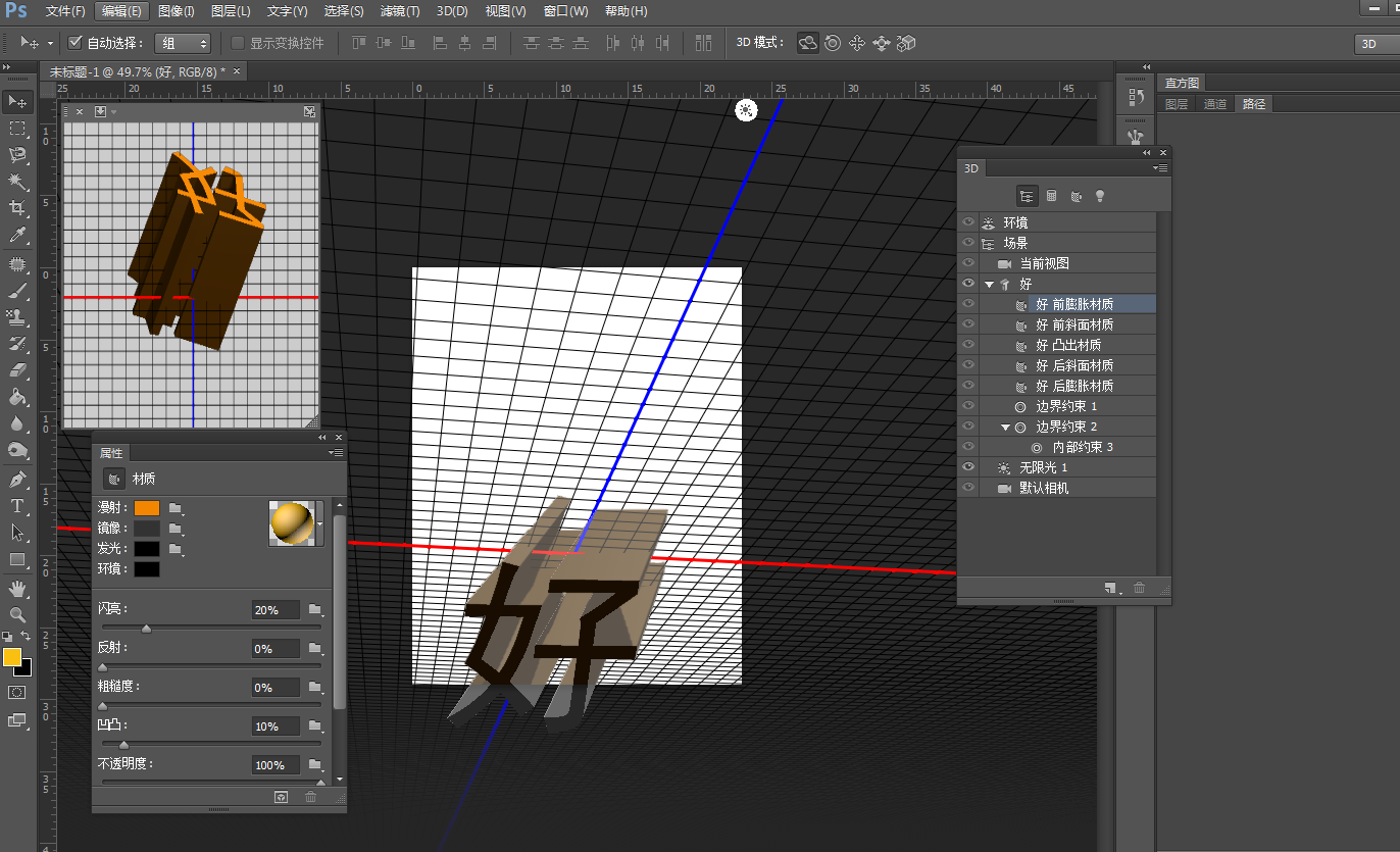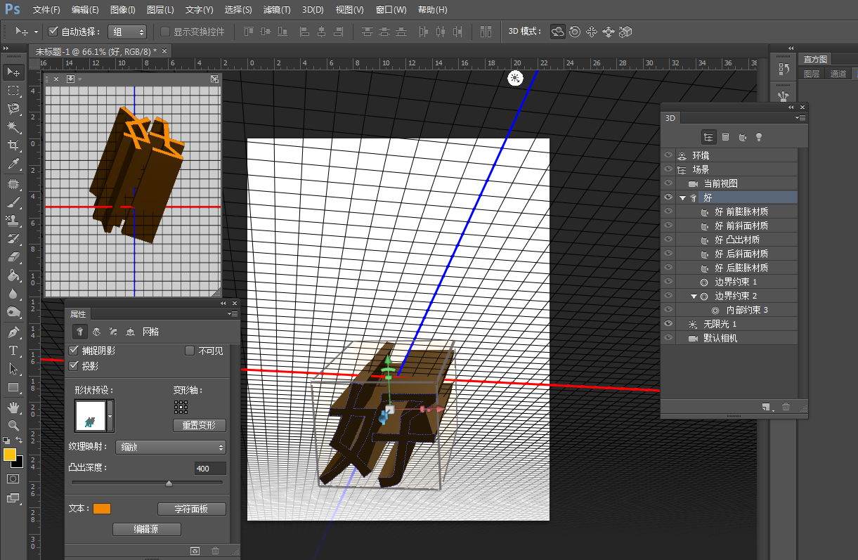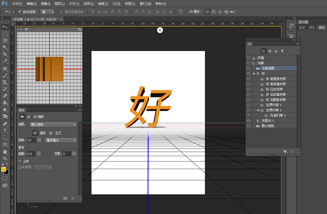 3D就是把平面变成立体图形或者文字都可以,具体操作我们以一个案例来认识一下我们看下图,任意打一个文字如好字,点击状态栏上的3D,选择从所选图层新建3D突出,我们调整3D各个参数时主要用到两个面板,一个是3D面板一个是属性在窗口可以找到如下图。