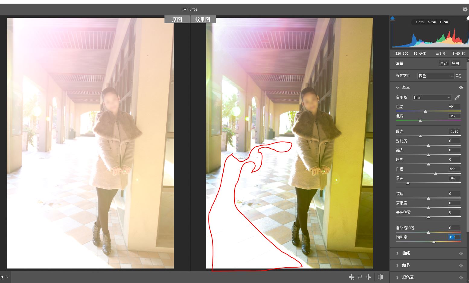 地板用红色画笔标注的那一片,怎么调整都白搭,因为过度曝光,颜色信息是0,这就是实例,参数大家可以参考,每个图像都不一样,根据结果预览图来拖动设置。