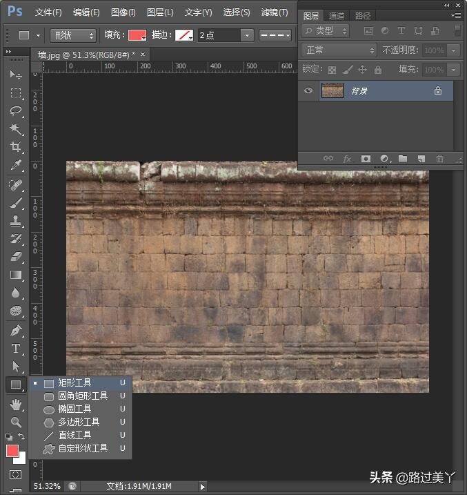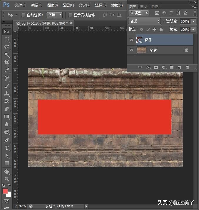 2、U,打开矩形工具,绘制一个矩形,红色填充。