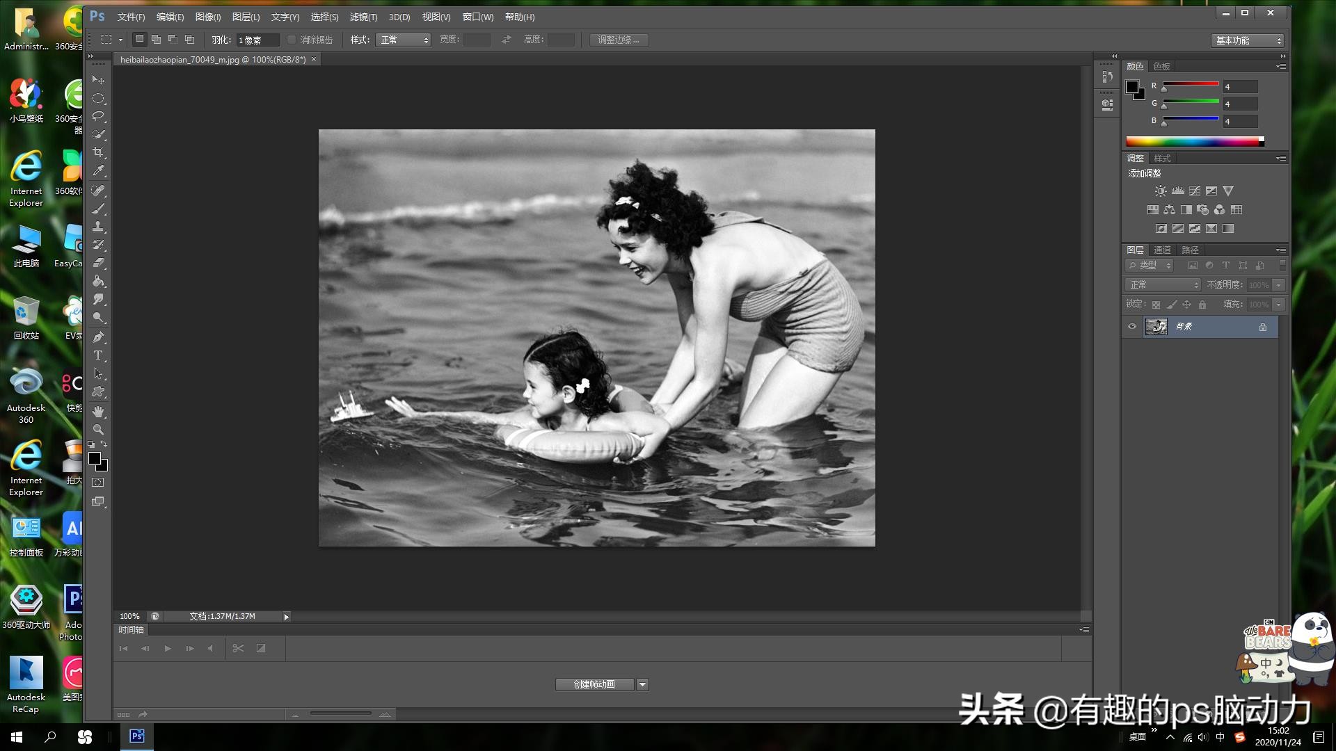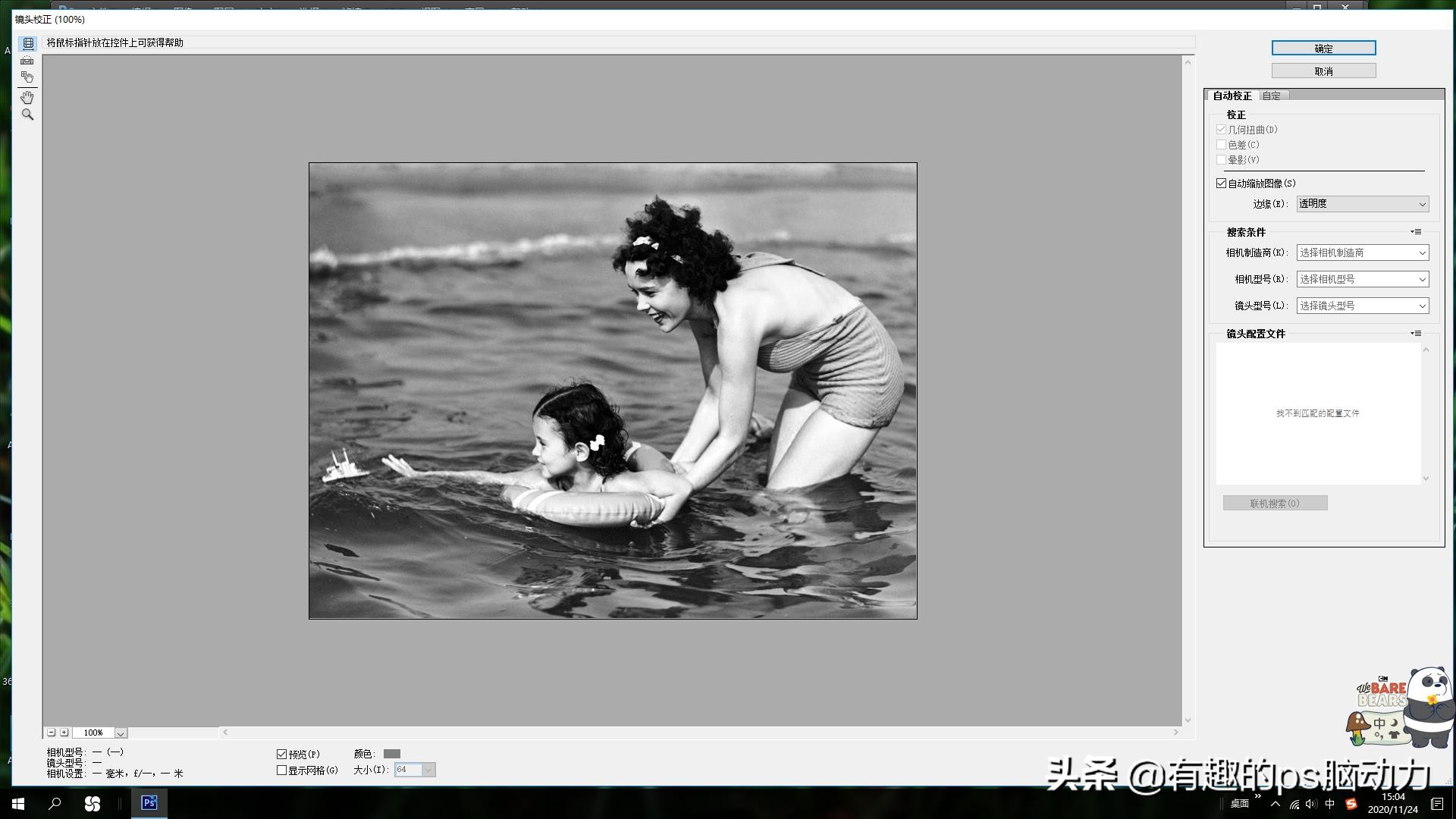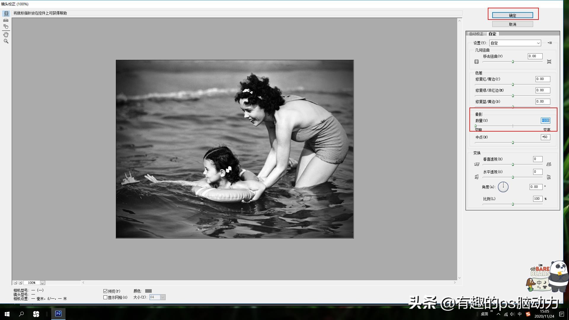 1.首先需要一张黑白的照片或者是图片素材,按Ctrl+O快捷键打开需要处理的素材图片,点击滤镜里的镜头校正,选择自定调整晕影,晕影需要调暗,数量(-100)点击确定,这样看来图片的边缘有暗淡效果,看以自学操作,看一下效果,我想掌握镜头校正不会太难。