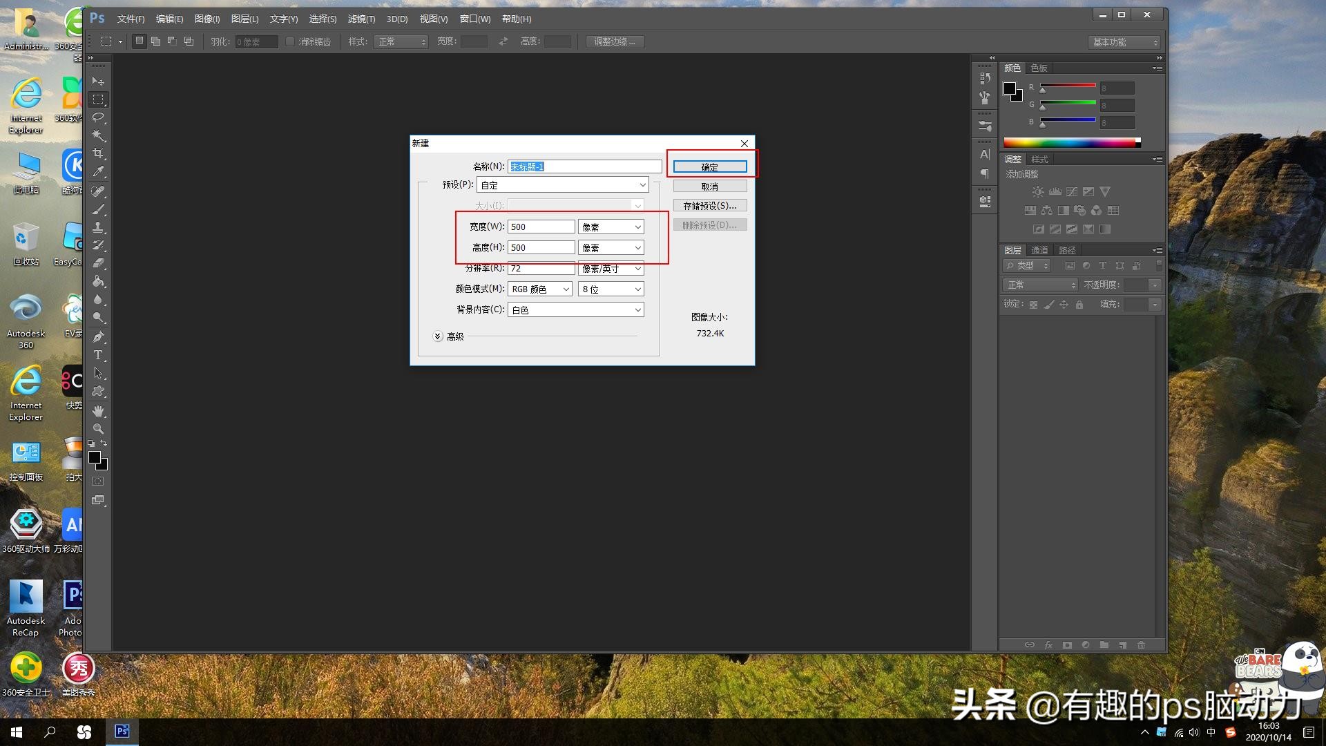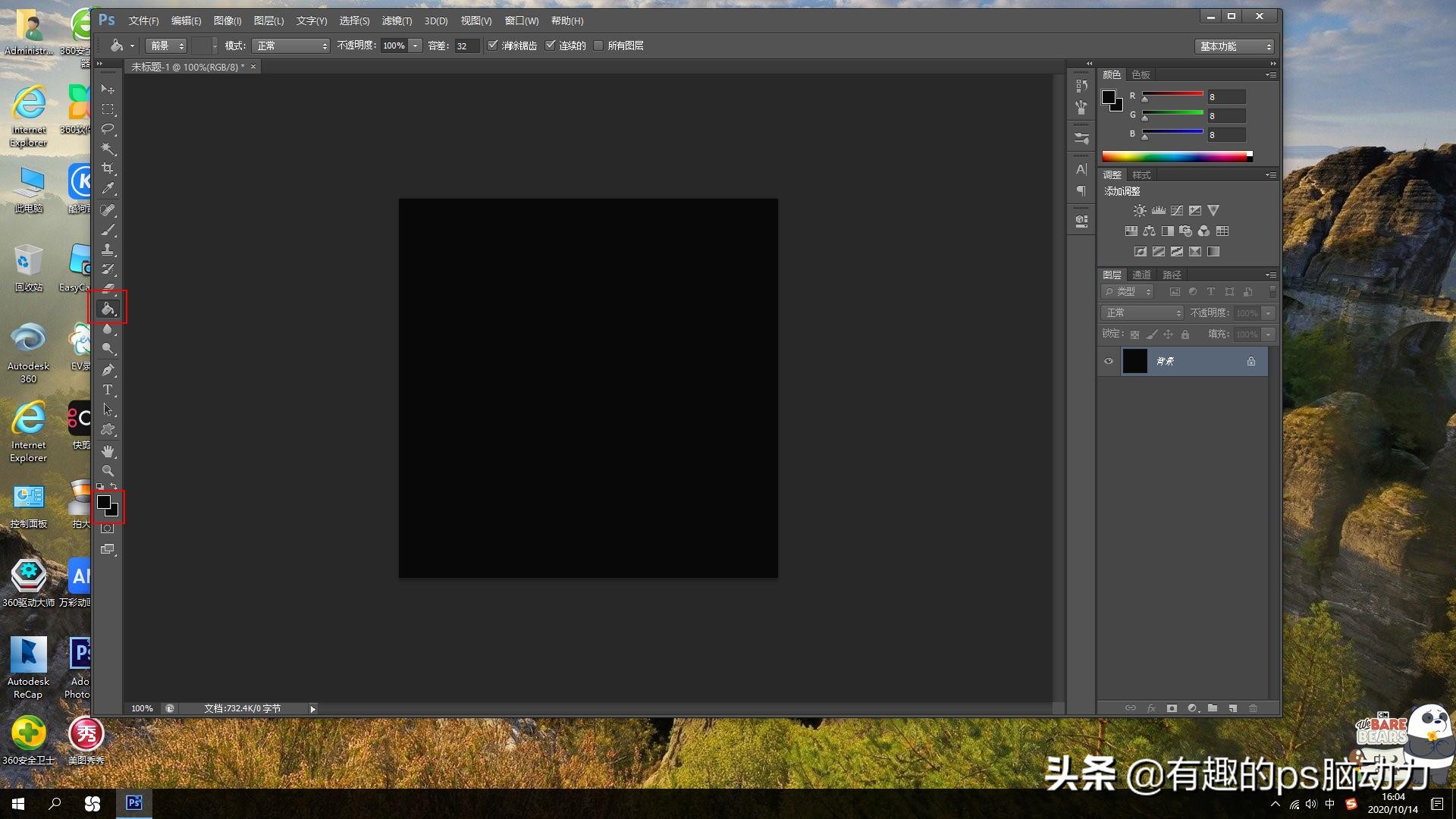 - 首先新建一个宽度500,高度500的画布,点击拾色器,前背景色设置为黑色,选择油漆桶工具进行填充,这一步对于新手来说,应该都会的,下面可以执行下一步的操作。