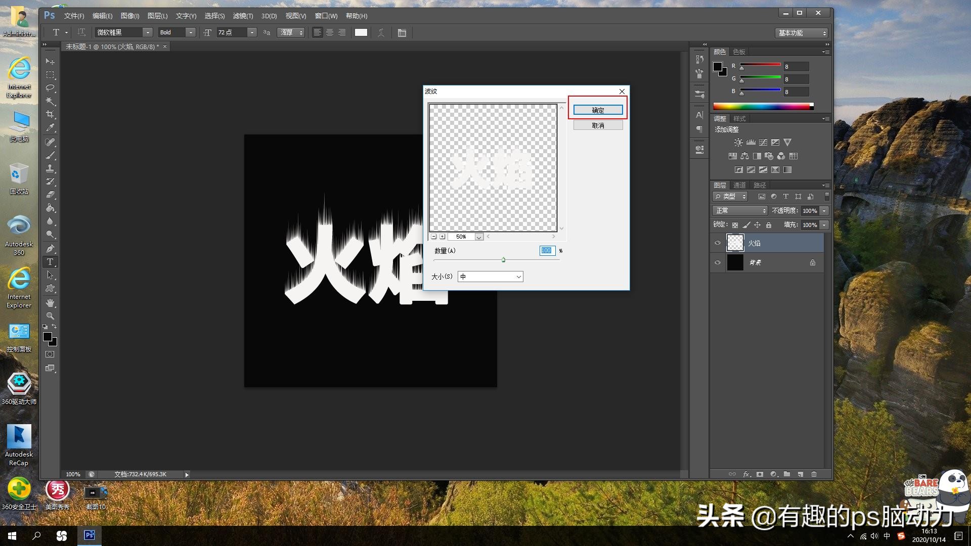 4.这样我们发现完全不会体现出火焰烧起来的效果,没关系接下来这一步,绝对可以达到效果,点击滤镜—扭曲—波纹,可以在波纹的对话框,看一下效果,如果真的不满意,可以尝试在连续重复一下效果,然后点击确定。