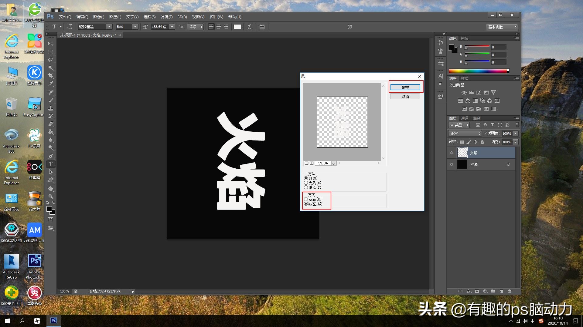 3.点击图像—旋转—顺时针旋转90度,把文字进行顺时针旋转,让文字方向倒转向右,接下来文字图层,需要栅格化,然后点击滤镜—风格化—风,风的方向一定要记住是向右,按Ctrl+f可以连续重复效果三次,最后点击图像—旋转—逆时针旋转90度,把文字在恢复原始的方向,接着按Ctrl+f再重复一次,可以看一下最终的效果。