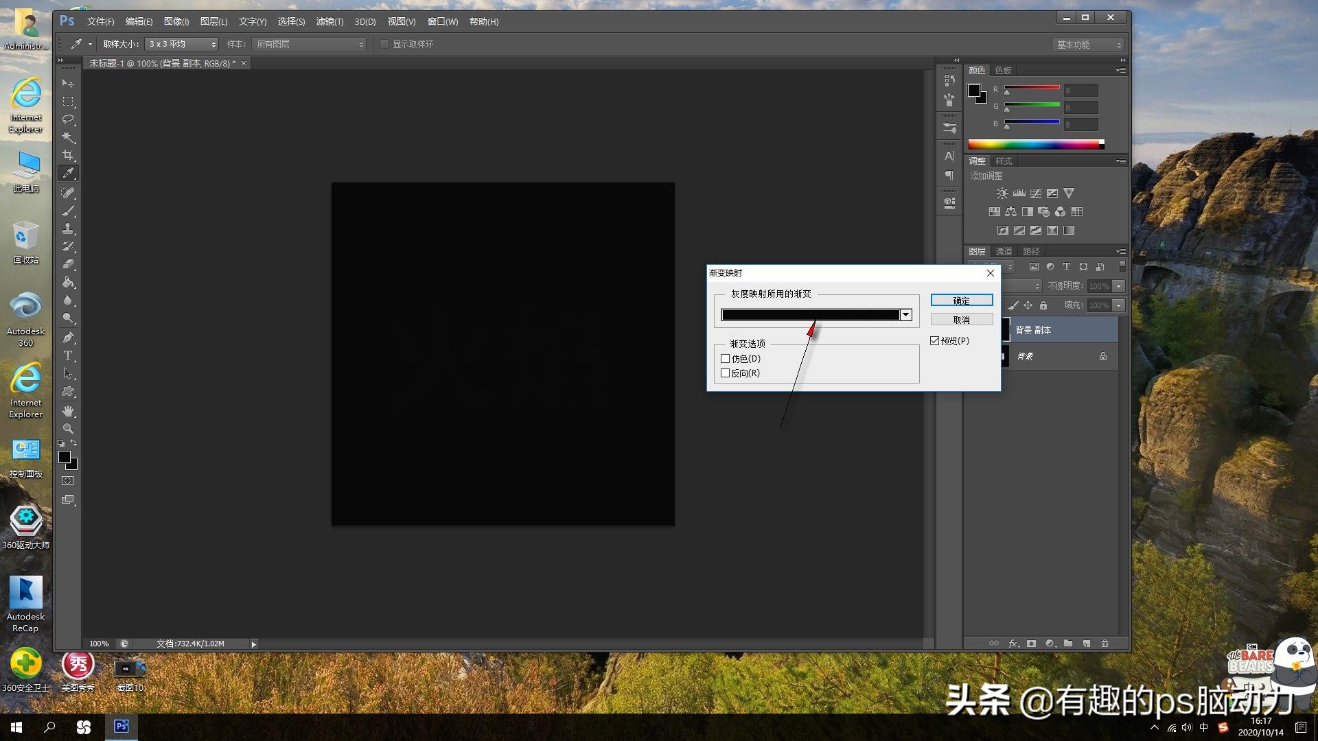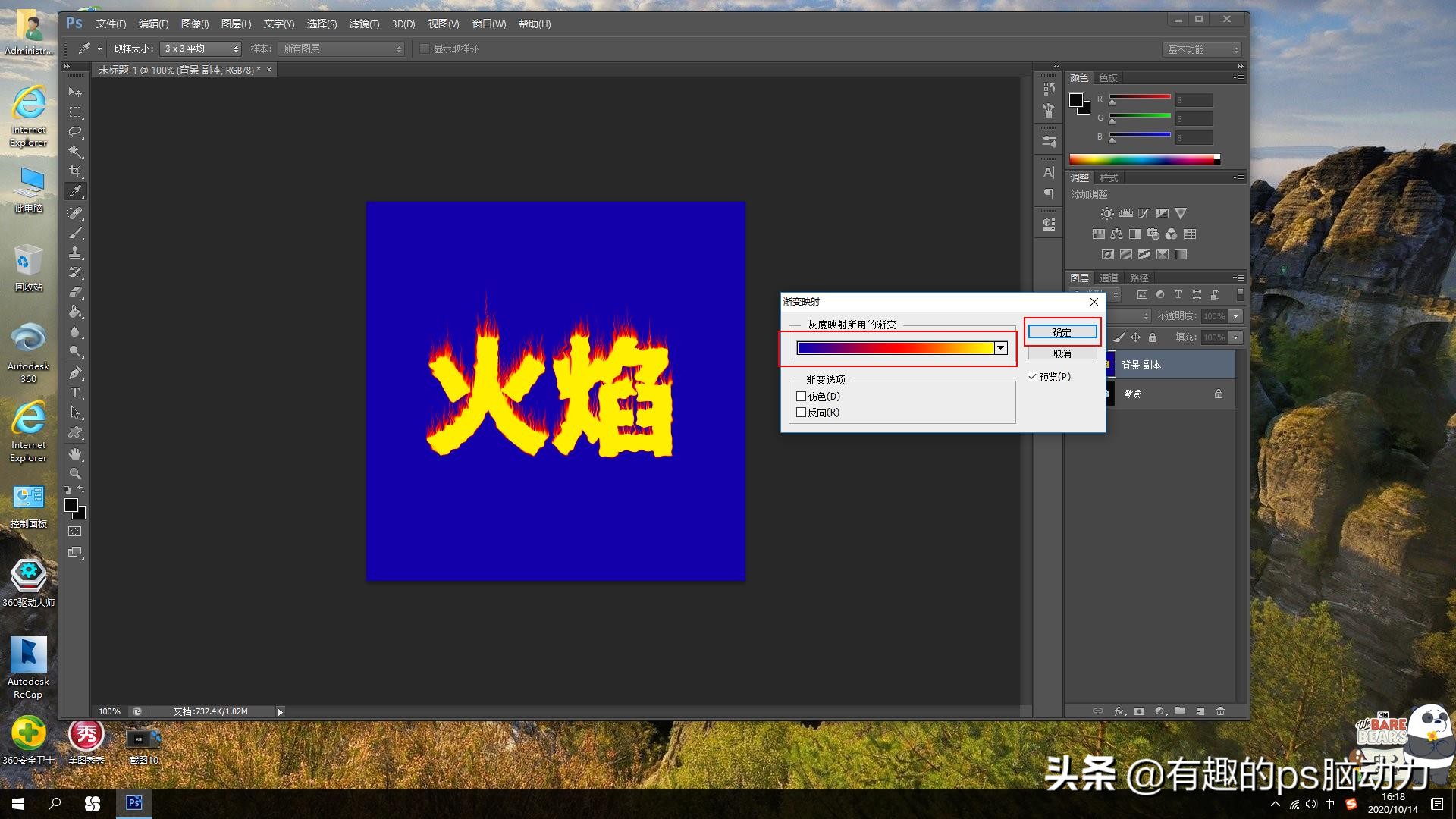 5.这样看来火焰特效文字还不错,只不过没有具备火焰的颜色,按住Shift键,单击鼠标选择合并图层,并且在复制,接下来点击图像—调整—渐变映射,选择一个符合规则的渐变,可以任意尝试一下,选择好了之后,点击确定,把文字图层的混合模式改为正片叠底,这样火焰特效文字就做好了。