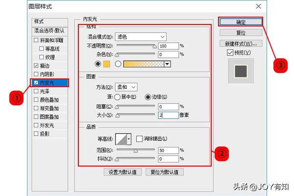 双击文字图层,或者是在“图层”面板底部选择“图层样式”图标,①选中“内发光”复选框,②设置相关参数,③单击“确定”按钮。如图所示: