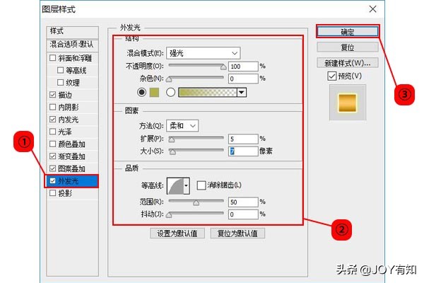 双击文字图层,或者是在“图层”面板底部选择“图层样式”图标,①选中“外发光”复选框,②设置相关参数,③单击“确定”按钮。如图所示: