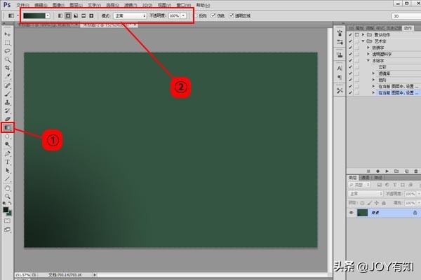 设置好前景色和背景色,①在工具箱中选择“渐变工具”,②在工具选项栏中进行设置,最后在图像上拖动鼠标,添加渐变效果。如图所示: