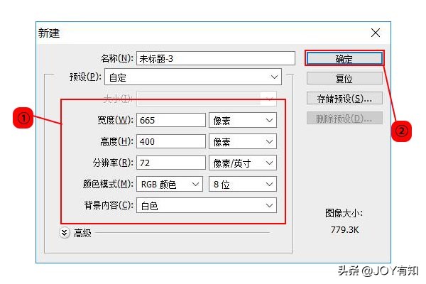 在Photoshop中新建文档,在弹出来的“新建”对话框中,①设置相关的参数,②单击确定按钮。如图所示: