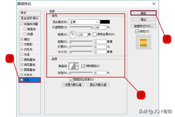 双击文字图层,或者是在“图层”面板底部选择“图层样式”图标,①选中“投影”复选框,②设置相关参数,③单击“确定”按钮。如图所示: