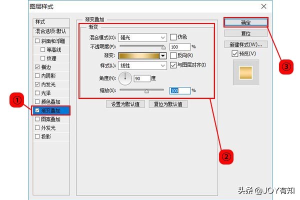 双击文字图层,或者是在“图层”面板底部选择“图层样式”图标,①选中“渐变叠加”复选框,②设置相关参数,③单击“确定”按钮。如图所示: