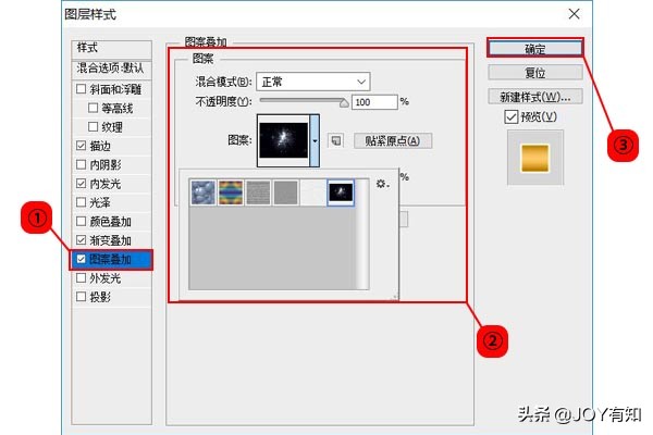 双击文字图层,或者是在“图层”面板底部选择“图层样式”图标,①选中“图案叠加”复选框,②设置相关参数,③单击“确定”按钮。如图所示: